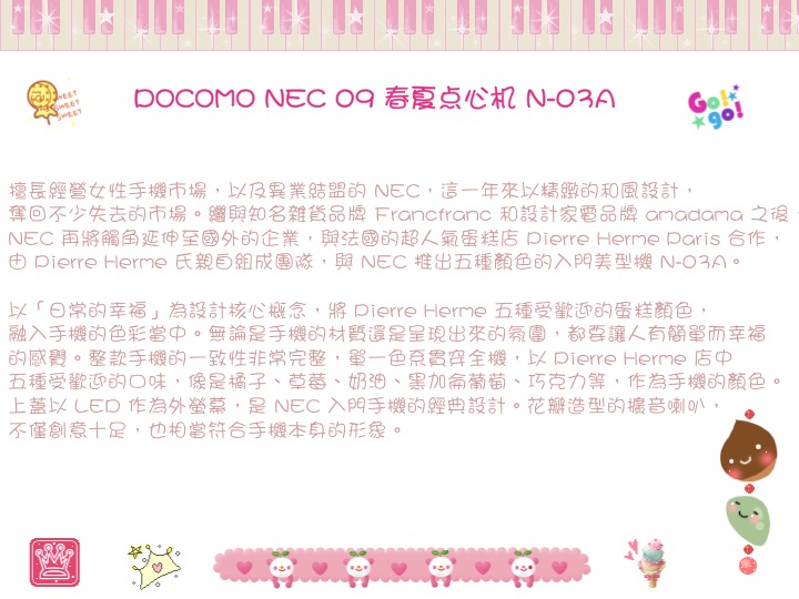 NEC发布了一款造型十分时尚可爱的翻盖机型N906iuPinkDiamond,属于906i系列机型。与大多数外观时尚的机型类似,N906iuPinkDiamond标上了SamanthaThavas牌子,后者是一家在日本非常流行的时尚饰品箱包品牌,具有不俗的影响力,这次NEC希望借助SamanthaThavas的品牌效应来带动这款手机的销量。